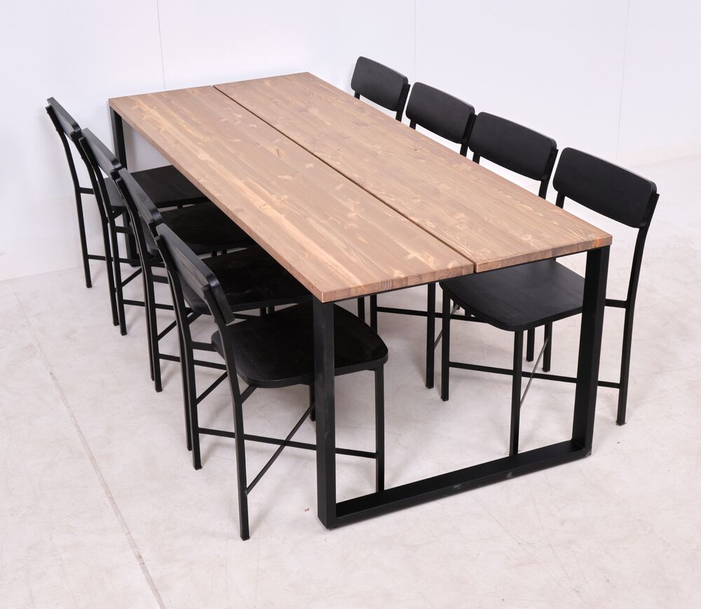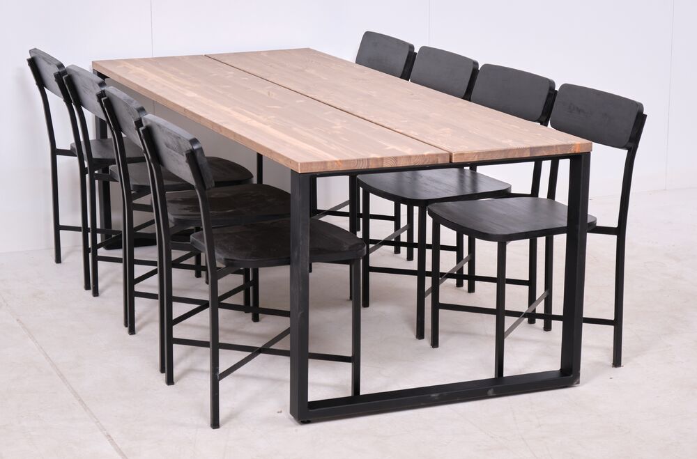 Pöydän kannen värin antiikkipetsattu mänty (vaaleanruskea antiikkisävy). Kansi on tehty kahdesta mänty lankusta. Pöydän jalat ovat mustaksi maalattua metallia. Tuolien istuinlevy ja selkänoja mustaksi petsattua mangoa ja tuolin runko metallia