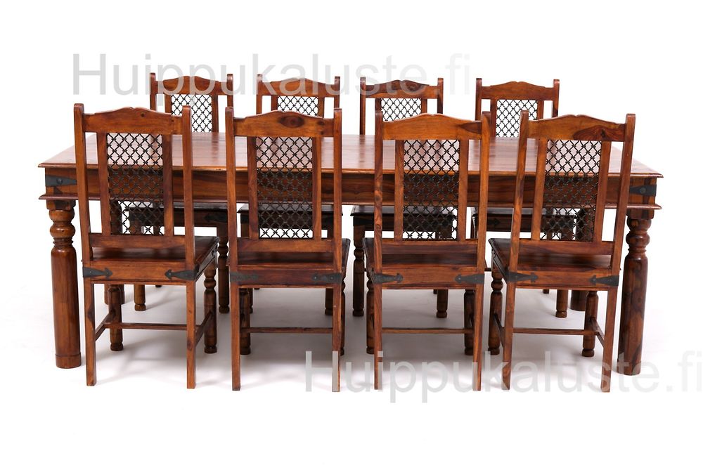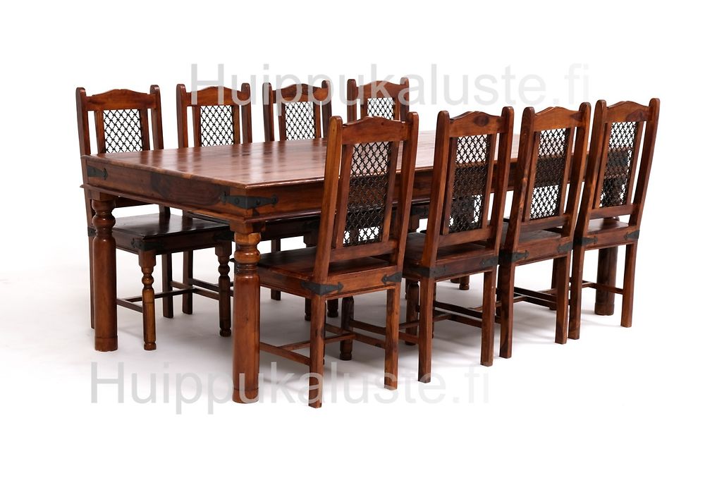 Upea 8-hengen Acazia ruokaryhmä. Tuote on valmistettu käsityönä akaasiapuusta, joka on tuotettu Intian valtion valvomalla akaasiaviljelmällä. Pöydän ja tuolien kaikki metalliosat on tehty takoraudasta.