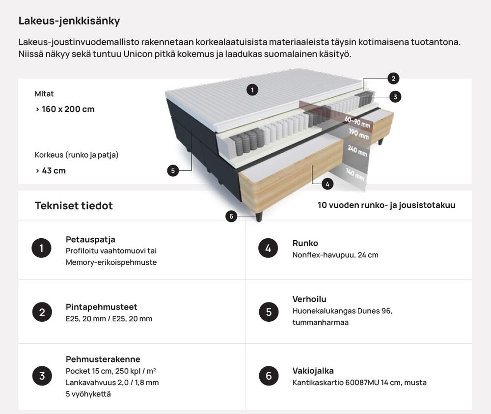 Lakeus-sängyt varustetaan viisivyöhykkeisellä karkaistulla Pocket-pussijoustinpatjalla, joka sisältää 250 teräsjousta neliömetrin alalla. Jousiston lankavahvuus 1.8/2.0mm. Pussijousistossa jouset pakataan pusseihin, jonka ansiosta jouset toimivat itsenäisesti ja patjan tuenta on optimaalinen kehon eri alueille. Vyöhykkeet (5-vyöhykettä) taas ovat jousiston kehon eri alueille suunniteltuja eri jäykkyystason alueita: patjan päätyosat joustavampia ja keskialue jäykempi. Sängyn alaosassa jousitukseton noflex kotelorakenne. Verhoiltu tummanharmaalla kankaalla. Patjan makuupinnassa joustokangas. Jalan korkeus 14cm. Patja koostuu kahdesta 80x200cm kokoisesta patjagrundista jotka asetetaan yhtenäisen patjan pussin sisälle, joka muodostaa täysleveän 160x200cm kokoisen patjan