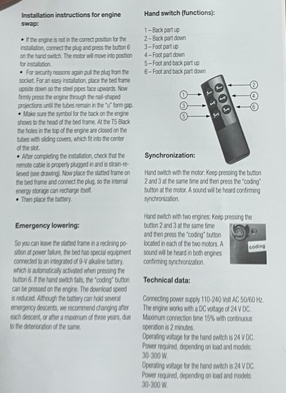 Tuote valmistettu Saksassa ja toimitetaan valmiiksi koottuna. Sängystä johon moottoripohja asetetaan täytyy ottaa sälepohja pois.