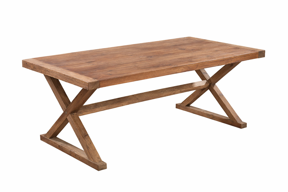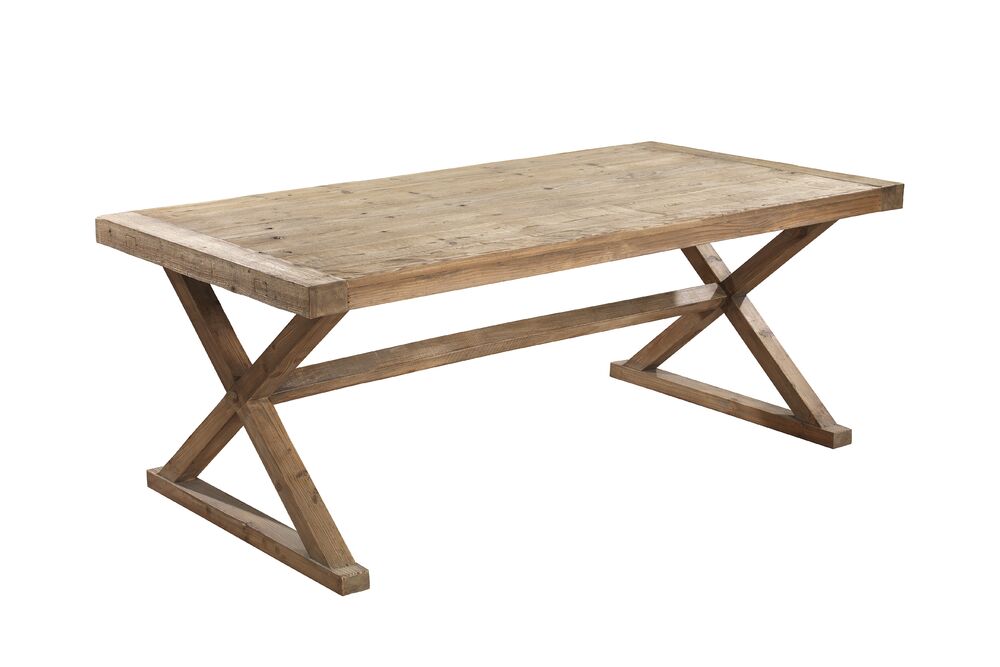 Tyylikäs ruokapöytä jossa näkyy ajanpatina. Pöytä on valmistettu kierrätetystä havupuusta.