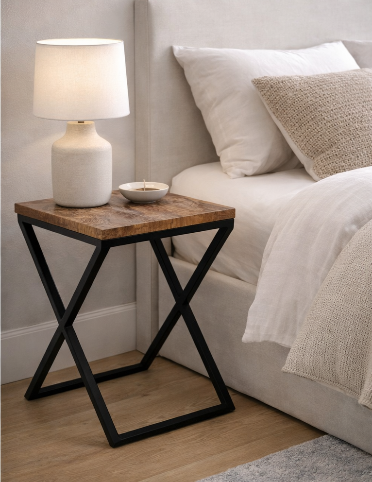 Kaunis kierrätyspuusta valmistettu pikkupöytä vaikka kukka-alustaksi tai yöpöydäksi. Tuotteen jalat valmistettu metallista.