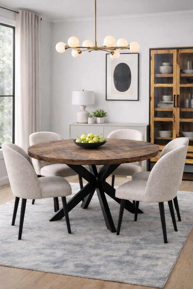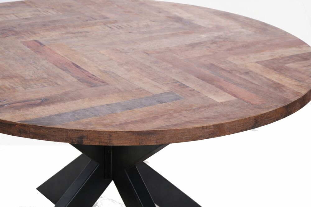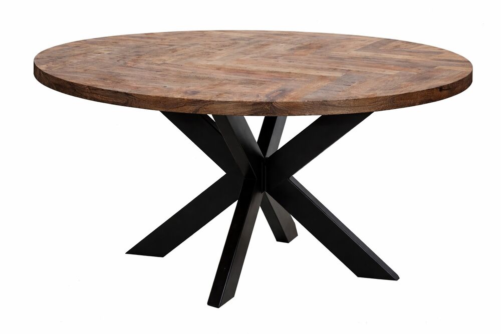 Upea ja tyylikäs musta metallista ja kalanruotokuvioidusta kierrätyspuusta valmistettu iso pyöreä rustiikinen ruokapöytä. Tämä massiivinen kalanruotopöytä sopii moneen sisustukseen.
