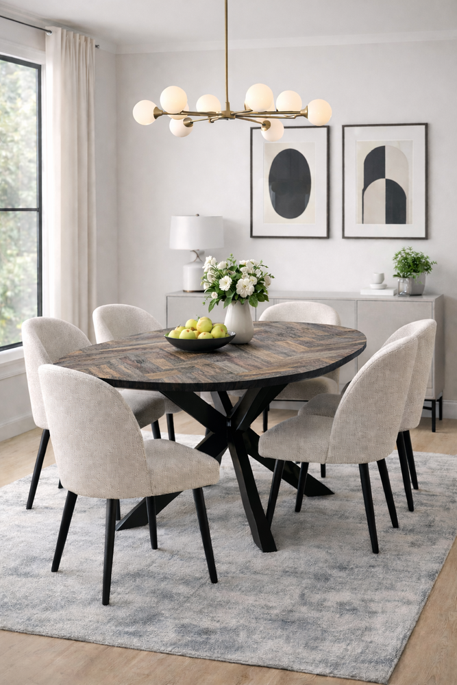 Upea ja tyylikäs musta metallista ja kalanruotokuvioidusta kierrätyspuusta valmistettu iso ovaali rustiikinen ruokapöytä. Tämä mahtava kalanruotopöytä sopii niin moderniin kuin rustiikkiseenkin sisustukseen.