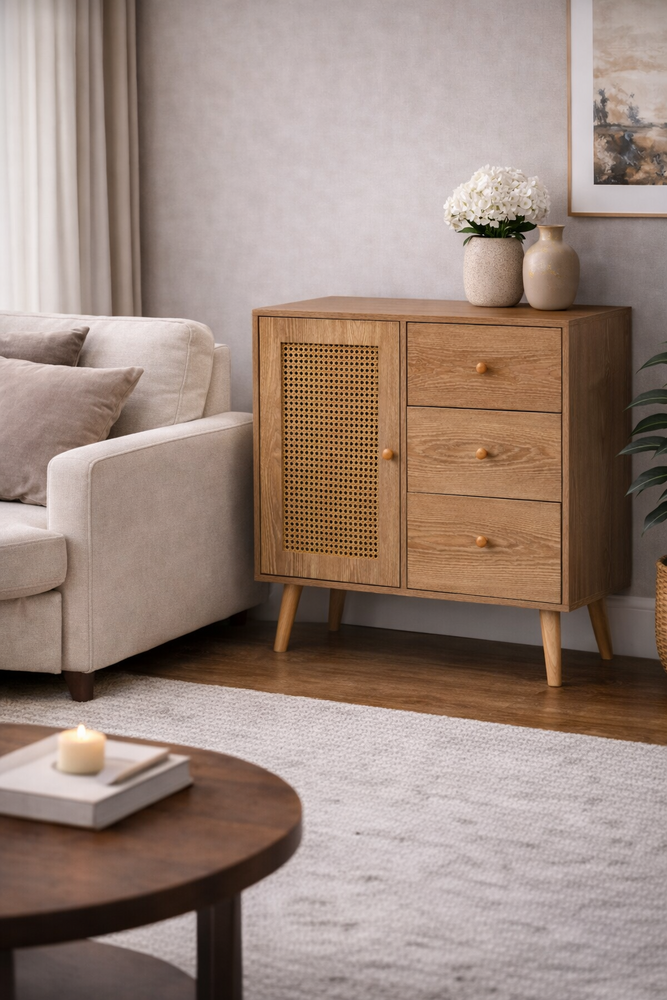 Kaunis rottinkiovellinen tv-taso avo-osalla...
