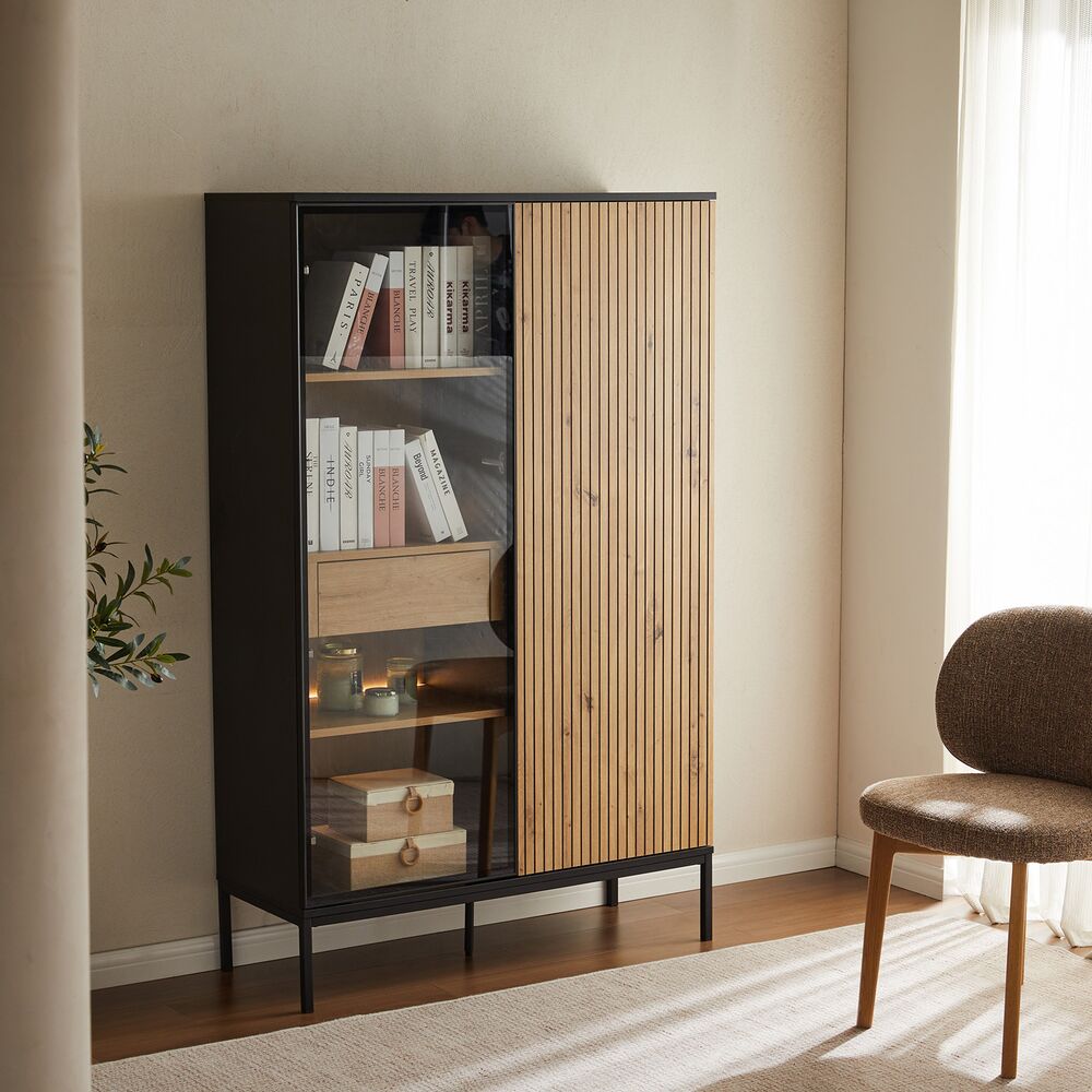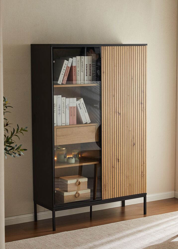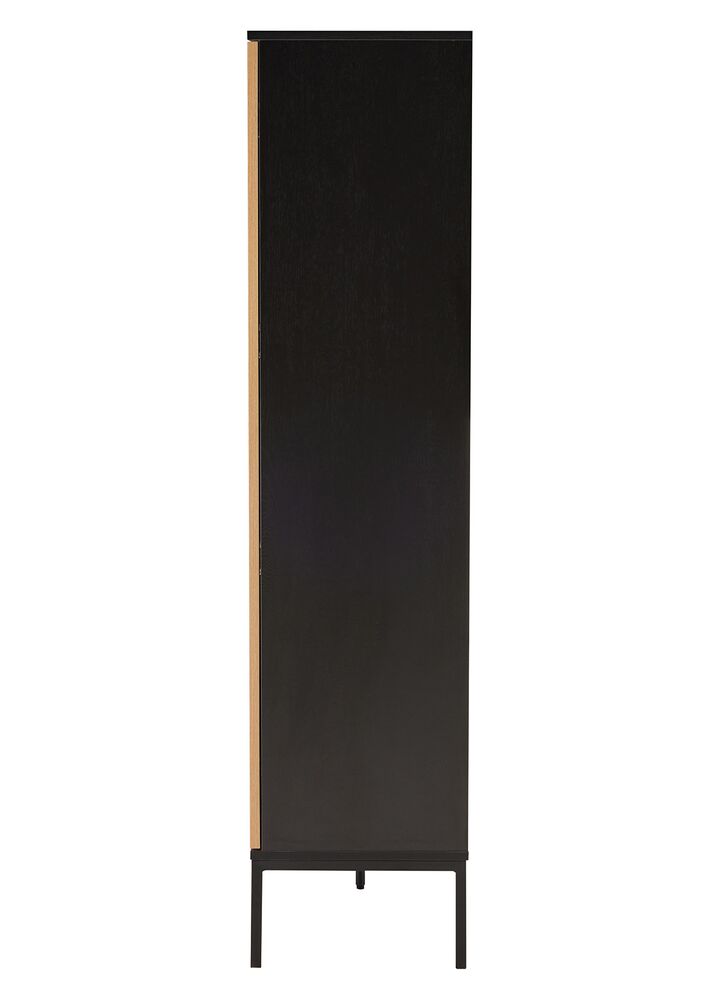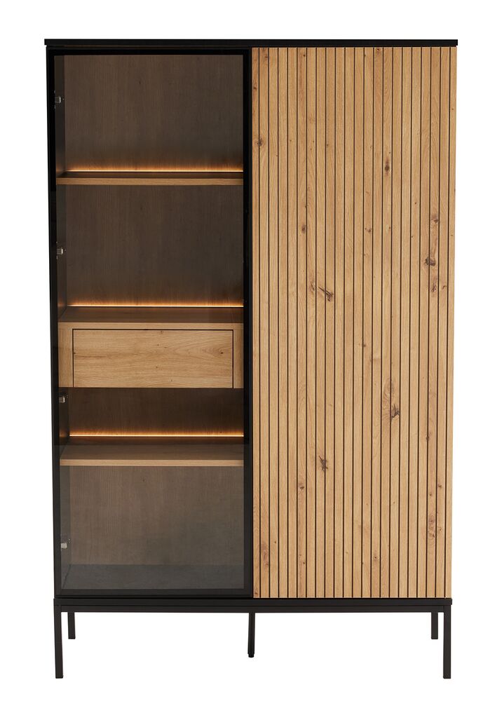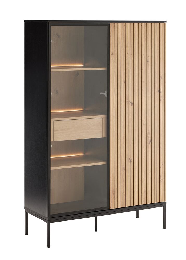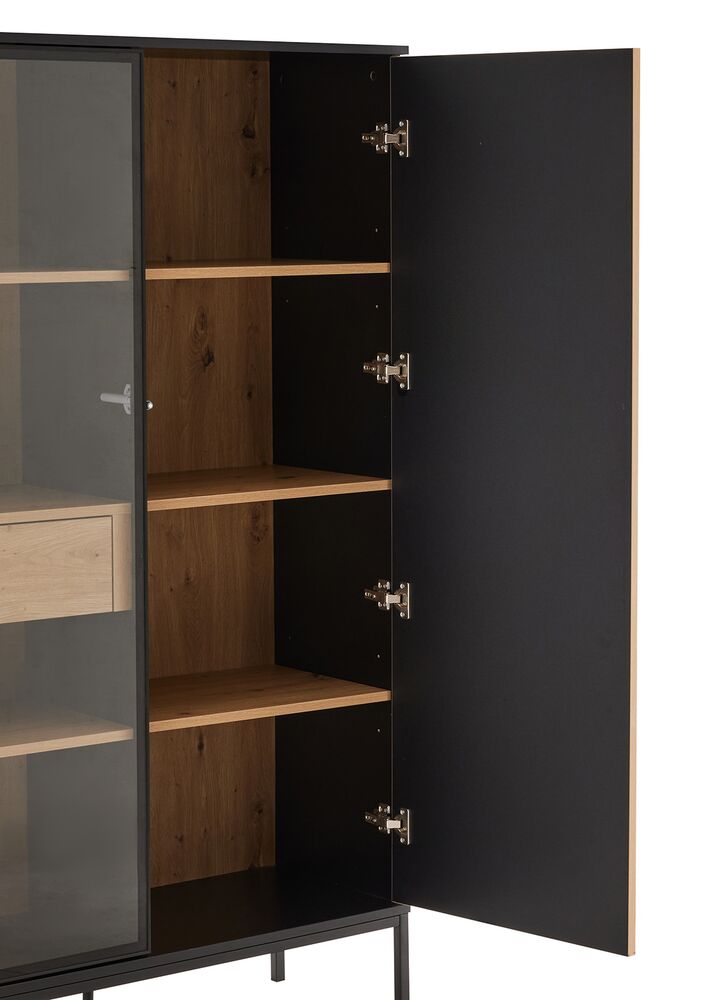 Moderni Java-vitriini, jossa tyylikäs LED-valaistus. Vitriinissa on kaksi kaappia, joissa jokaisessa on välihyllyt. Vitriinin musta runko on 16 mm paksua laminoitua kalustelevyä ja siinä on ABS-reunanauha. Ovissa on push-to-open -mekanismi. Jalat ovat mustaksi maalattua metallia. Lasioven takana lisäksi vetolaatikko. 18cm korkeat jalat helpottavat siivousta tuotteen alta.