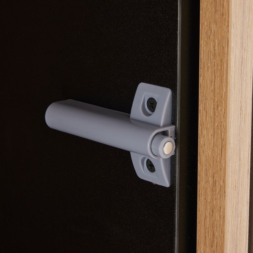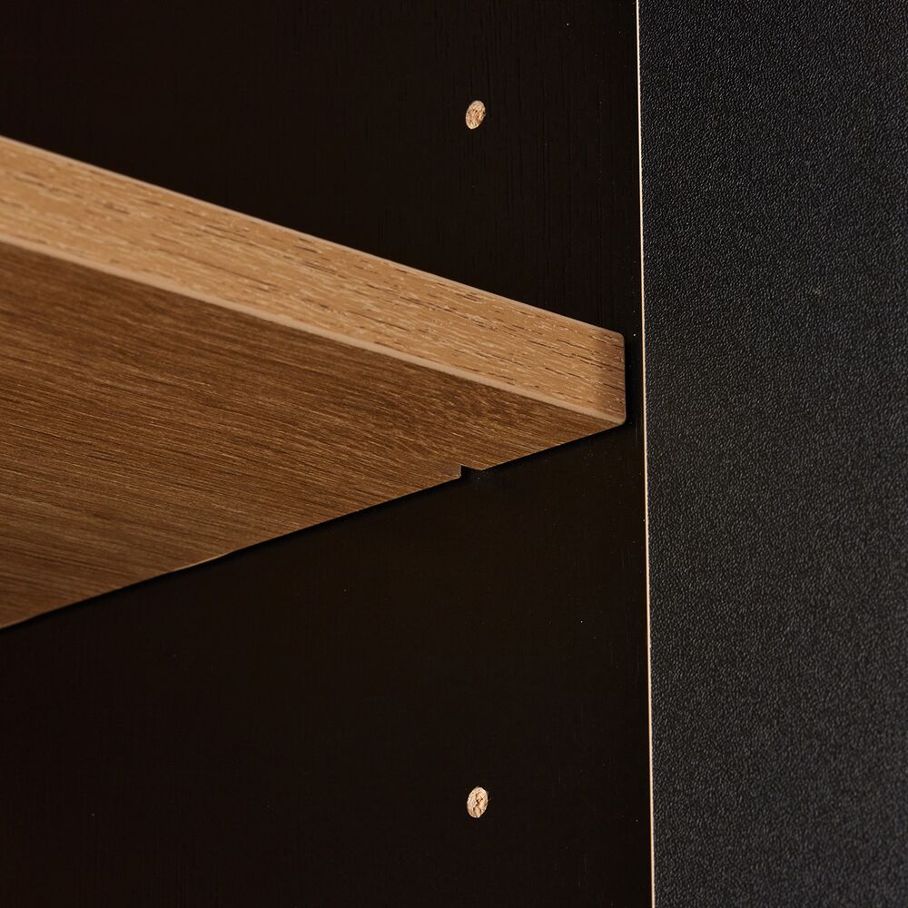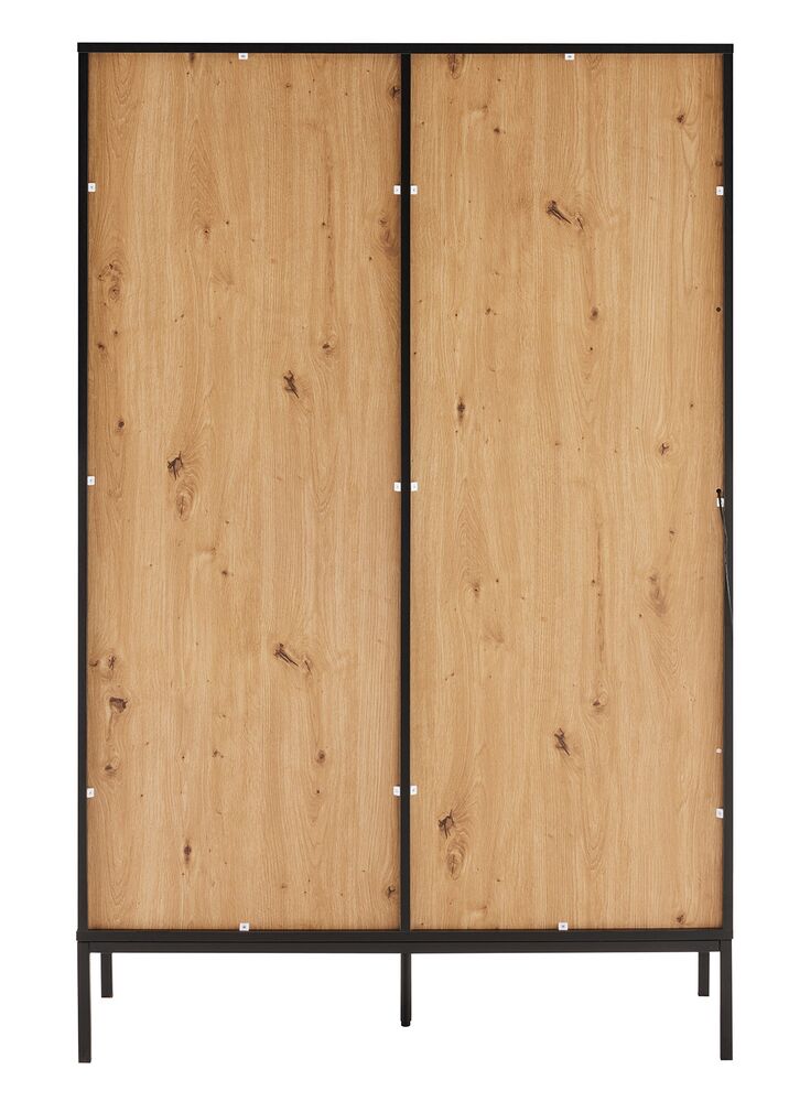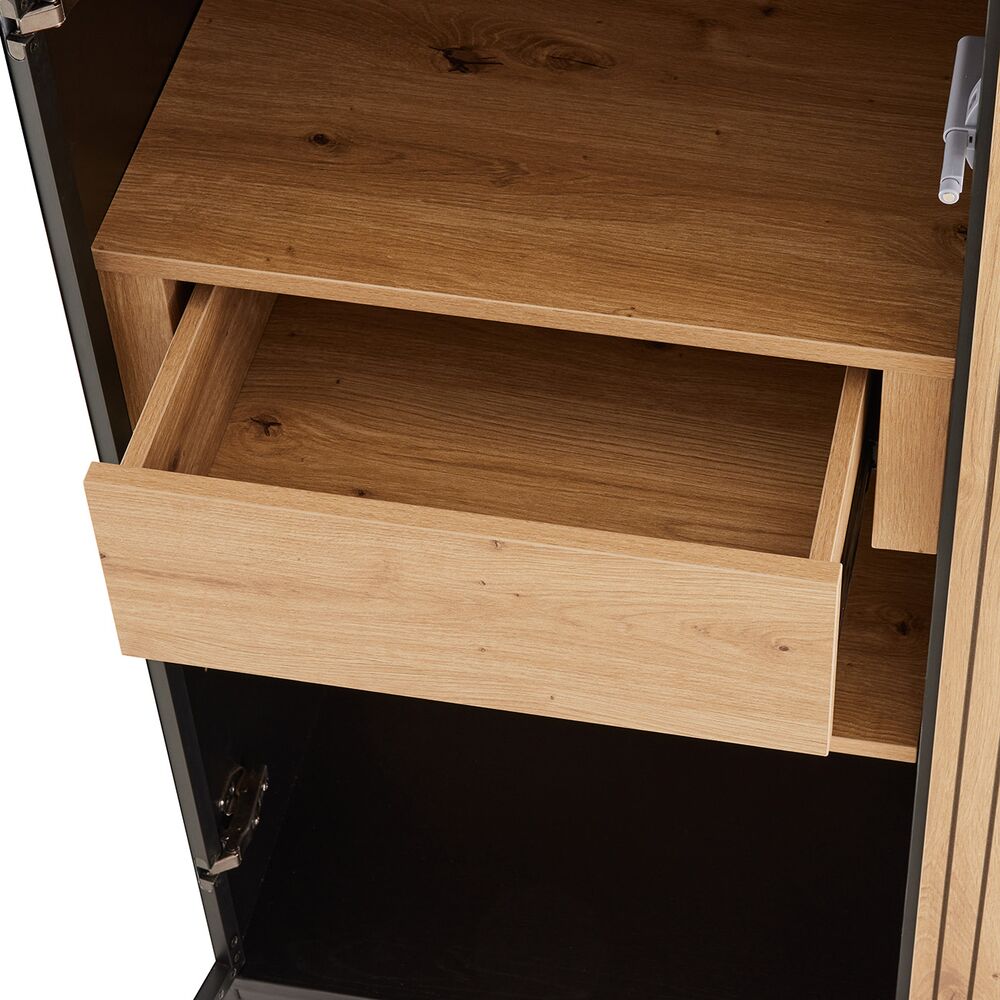 Moderni Java-vitriini, jossa tyylikäs LED-valaistus. Vitriinissa on kaksi kaappia, joissa jokaisessa on välihyllyt. Vitriinin musta runko on 16 mm paksua laminoitua kalustelevyä ja siinä on ABS-reunanauha. Ovissa on push-to-open -mekanismi. Jalat ovat mustaksi maalattua metallia. Lasioven takana lisäksi vetolaatikko. 18cm korkeat jalat helpottavat siivousta tuotteen alta.
