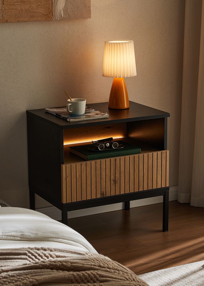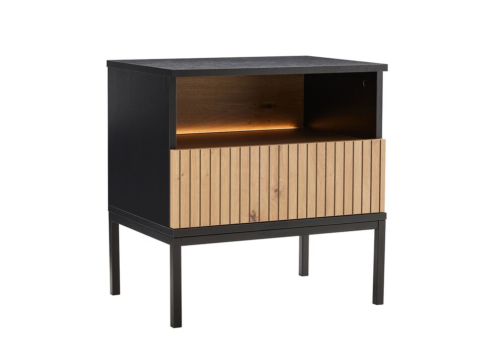 Moderni Java yöpöytä, jossa tyylikäs LED-valaistus. Yöpöydässä on vetolaatikko ja avo-osa. Yöpöydän musta runko on 16 mm paksua laminoitua kalustelevyä ja siinä on ABS-reunanauha.