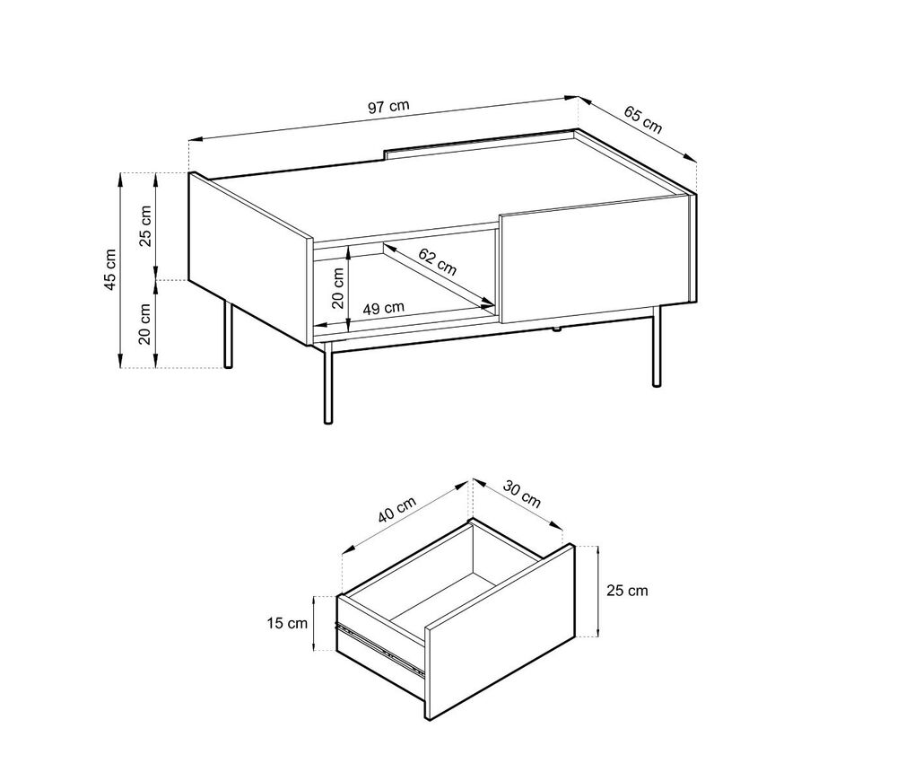 Tyylikäs ja kauniin linjakas Puuteri-sohvapöytä upeassa greigen sävyssä. Sohvapöydästä löytyy vetolaatikot metalliliukukiskoilla pöydän molemmin puolin sekä koko pöydän syvyinen avohylly. Sohvapöydän greige runko sekä laatikoiden etusarjat ovat 16 mm paksua laminoitua kalustelevyä ja molemmissa on ABS-reunanauha. Kansi, pohja sekä väliseinä ovat vaalean tammen väristä 16 mm paksua laminoitua kalustelevyä. Sohvapöydän greigen väriset jalat ovat pulverimaalattua metallia ja niiden korkeus on 20 cm.