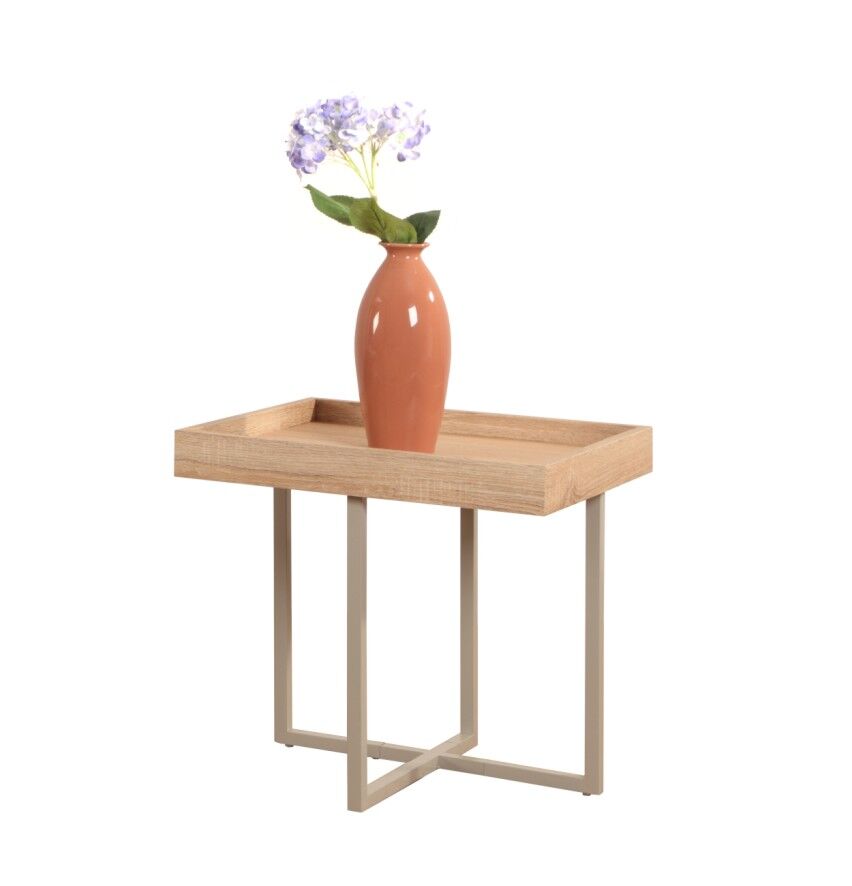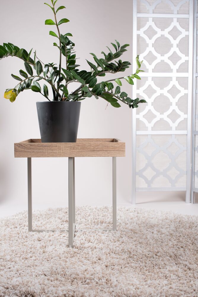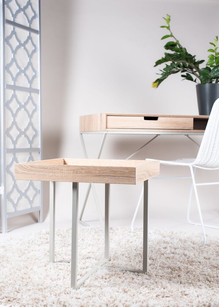Materiaali mdf-levy jossa tammilaminointi. Maalatut metallijalat.