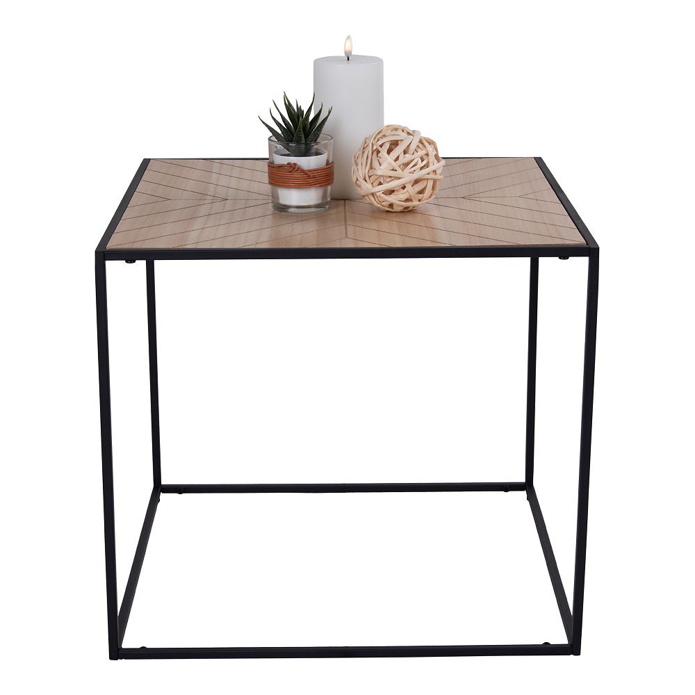 Kaunis kantikas sohvapöytä jossa vanerikansi ja musta metallirunko