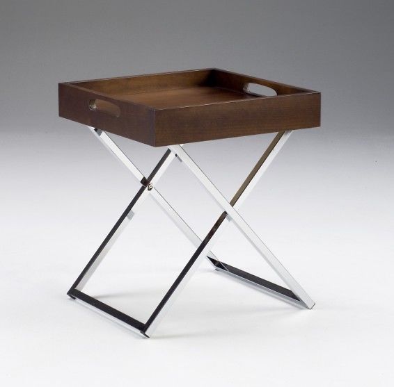 Näppärä tarjoilupöytä pähkinän värisellä kannella ja kromatuilla jaloilla