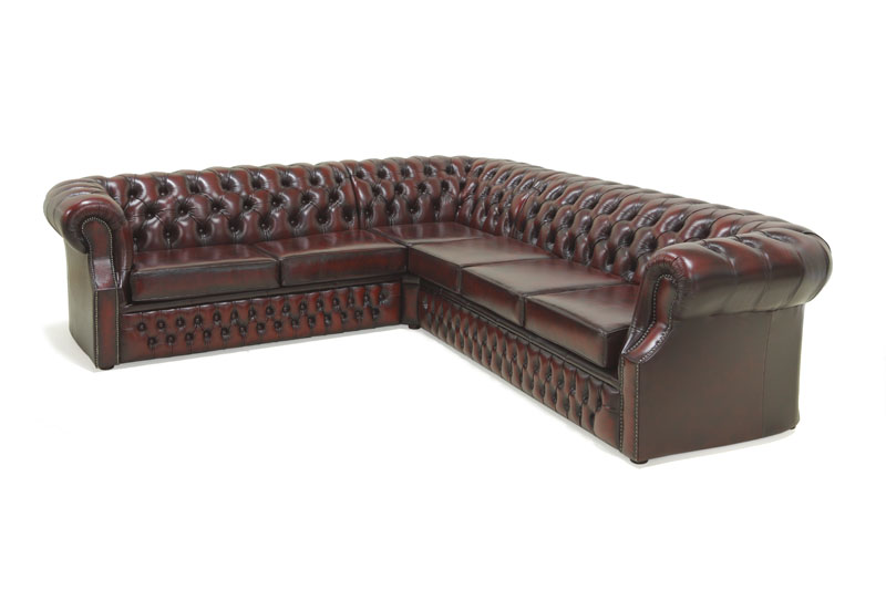 Upea ja jämäkkä antiikkinahkainen Chesterfield kulmasohva vuodemekanismilla.