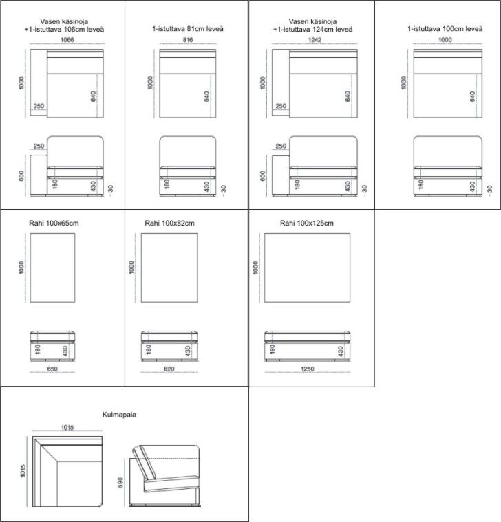 1-istuttavan keskipalan leveys on 81- tai 100cm. Vasemman puoleisen palan voit valita 106- tai 124cm leveänä. Oikeaan reunaan tulevan kulmapalan leveys on aina 101cm.