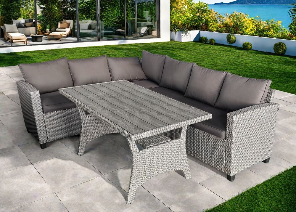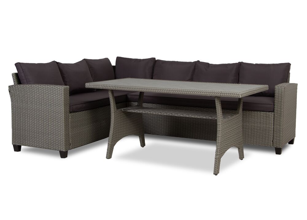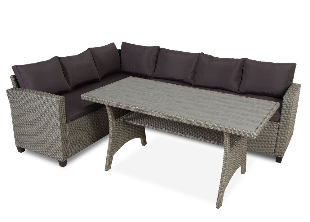 Helppohoitoinen ja huoltovapaa polyrottinkinen kulmasohva, sekä pöytä. 6cm vahvat vettähylkivät polyester-kankaiset pehmusteet kuuluvat hintaan. Hintaan kuuluu polyrottinkinen pihakäyttöön soveltuva kulmasohva pehmusteineen ja pöytä.