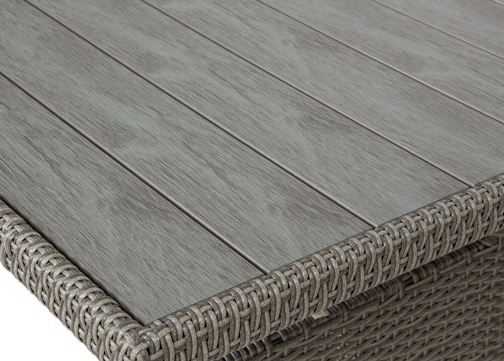 Polyrottinki on huoltovapaa, kestävä ja tyylikkään näköinen materiaali. Pinnat voi puhdistaa pölystä vaikka puutarhaletkulla huuhtelemalla. Pöydän kansilevy puukuviotua muovia (artwood). Istuinpehmusteen paksuus noin 6cm. Pehmusteet suositellaan säilyttämään sateelta suojassa.