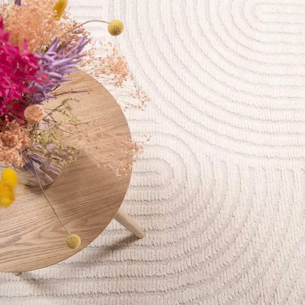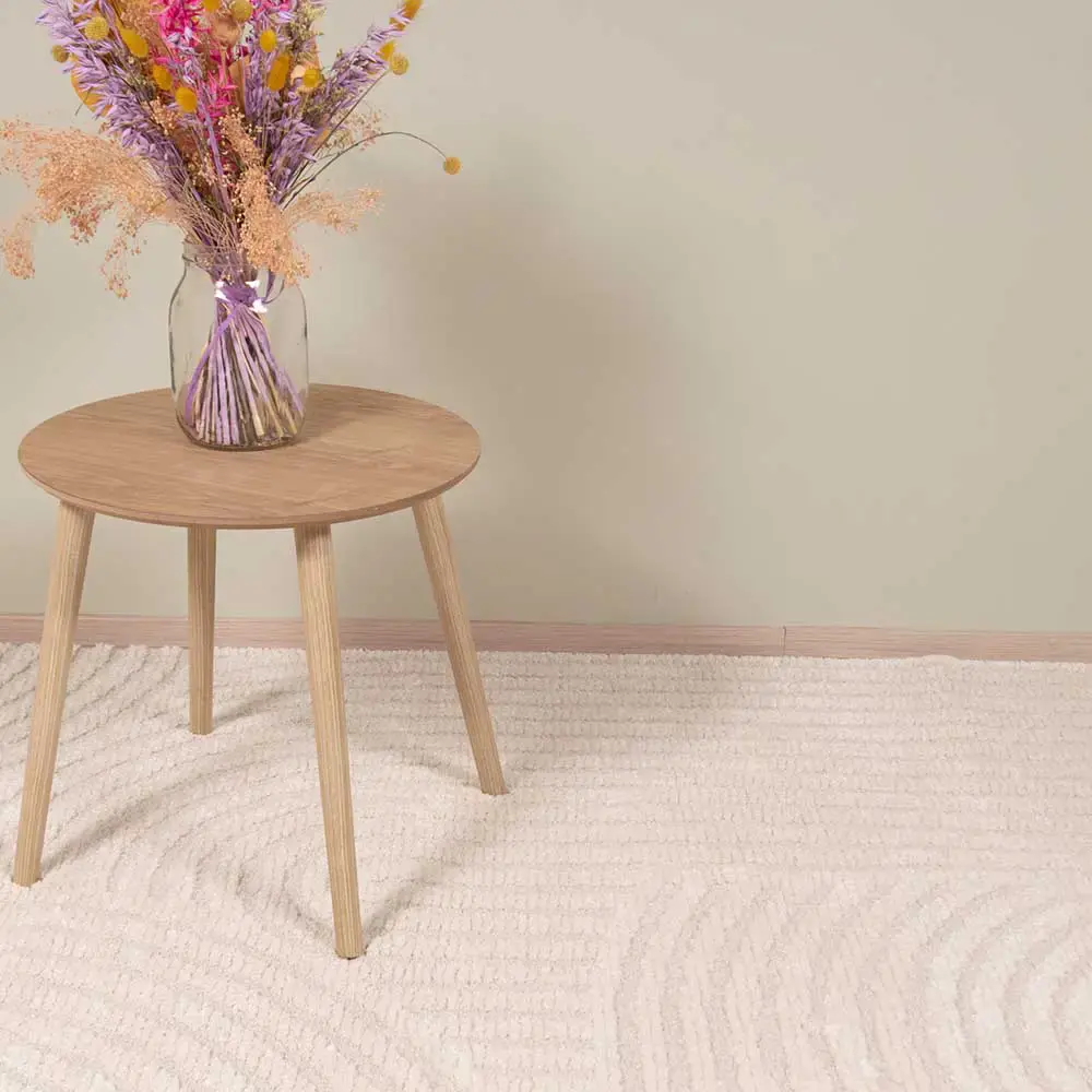 Lyhytnukkainen Deco matto sopii erinomaisesti olohuoneen sohvaryhmän yhteyteen. Nukkamatto on hyvä valinta tuomaan pehmeyttä ja hotellimaista tunnelmaa myös makuuhuoneeseen ja työhuoneeseen. Valitse tilaan tarpeeksi suuri matto, jotta saat koottua kalusteet kauniiksi kokonaisuudeksi. Luonnonvalkoinen matto on ajaton ja se onkin helppo yhdistää kodin muuhun sisustukseen. Maton kaunis kaarikuvio muodostuu eri pituisista nukista. Deco nukkamatto on pölyämätön ja vesipestävä. Maton pohja on karhea, joten suosittelemme alle liukuestehuopaa.