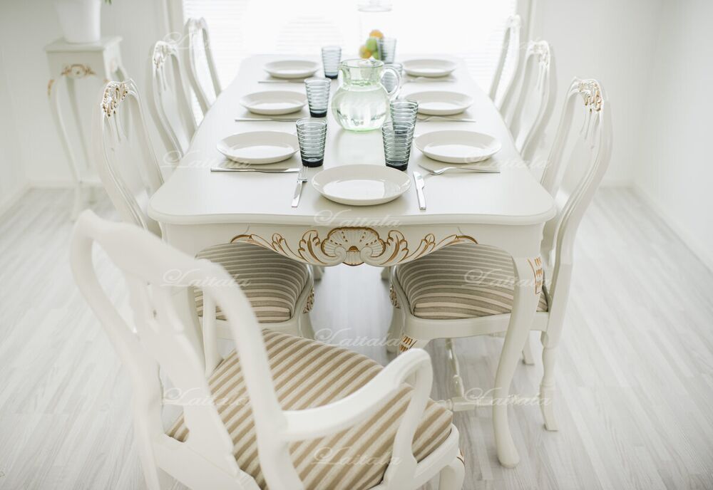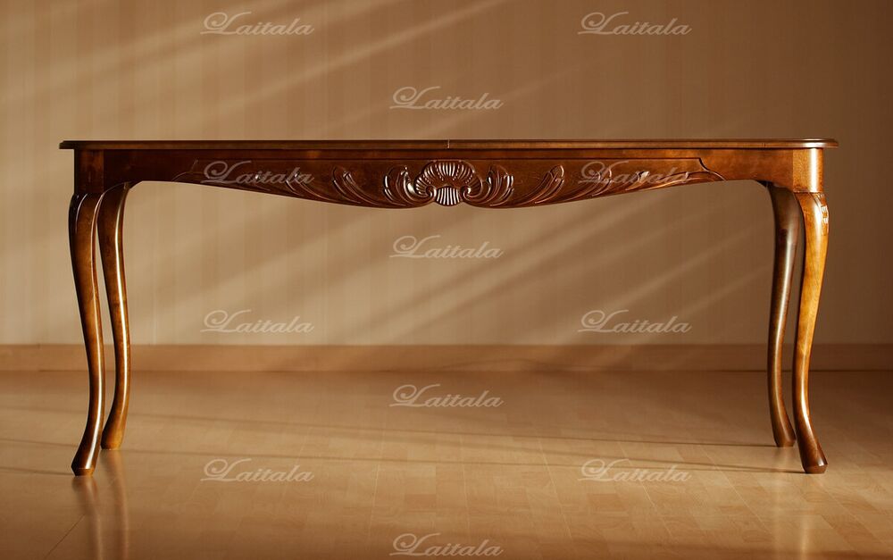 Kotimainen Laitalan valmistama ja käsityönä perinteisiä menetelmiä käyttämällä valmistettu Talonpoikaisrokokoo ruokapöytä. Kysy lisää tai tilaa esite tuotteista