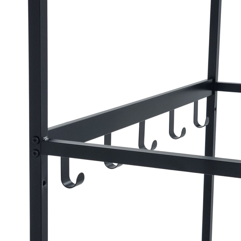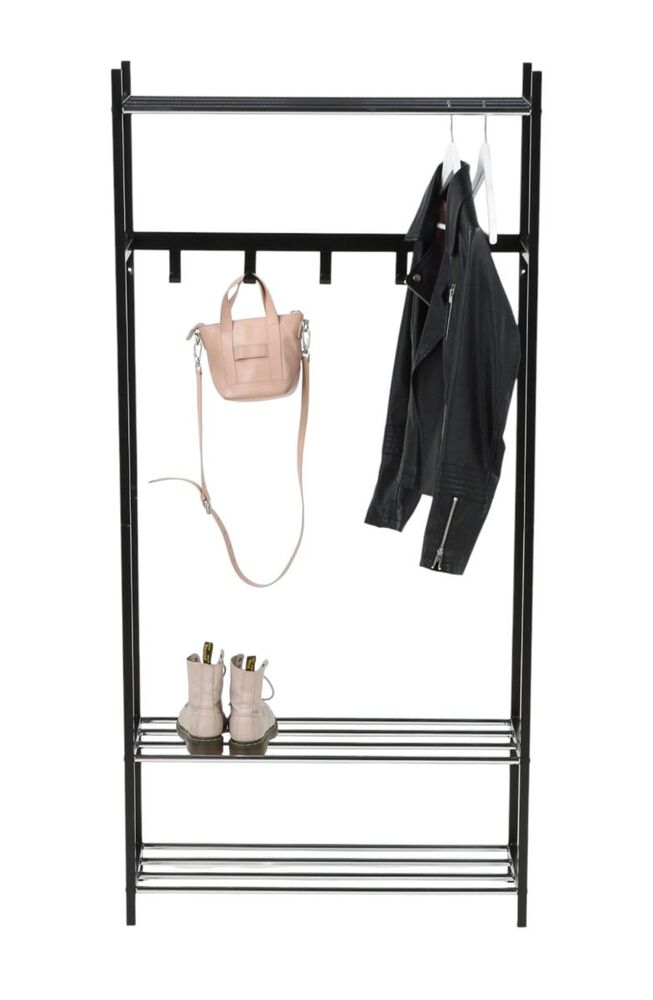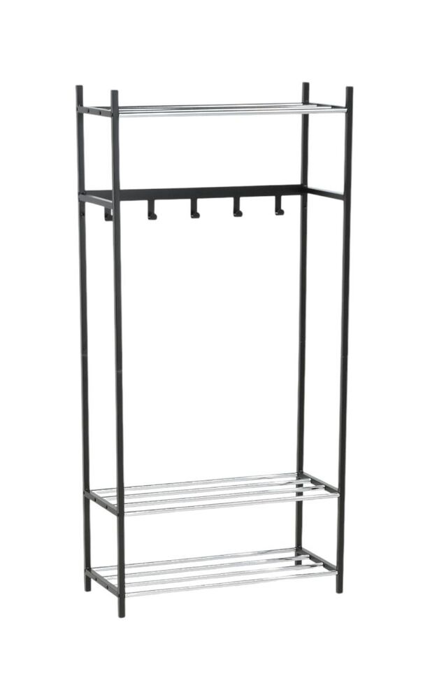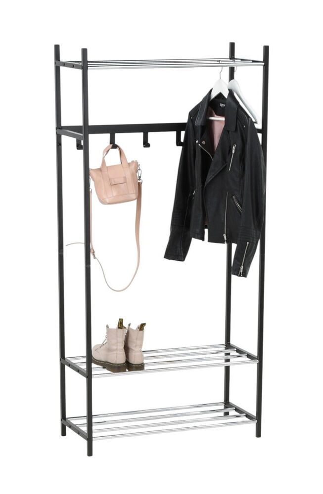 Tyylikkään Lidia-vaatenaulakon musta runko sekä koukut ovat metallia ja ritiläputket kromattua metallia. Vaatenaulakon leveys on 80 cm, syvyys 35 cm ja korkeus 166 cm. Väli lattiasta alatasoon on 7 cm, kahden alimman hyllyn väli 25 cm ja kahden ylimmän hyllyn väli 122 cm. Ritiläputkien leveys on 76 cm. Toimitus osina.