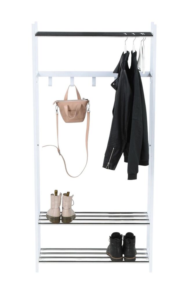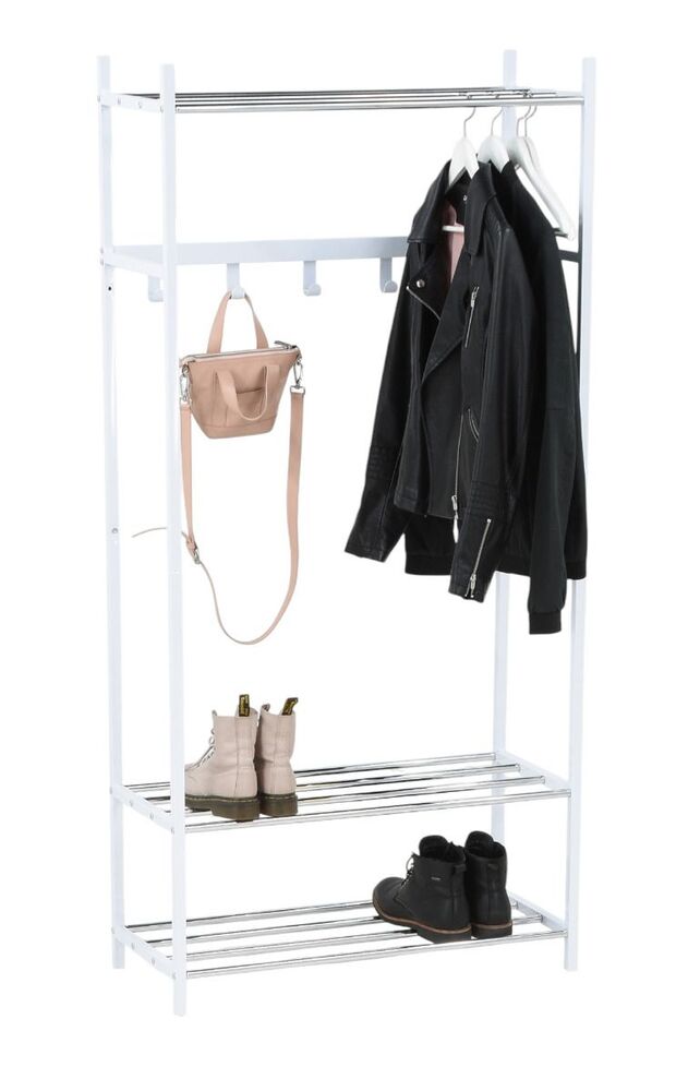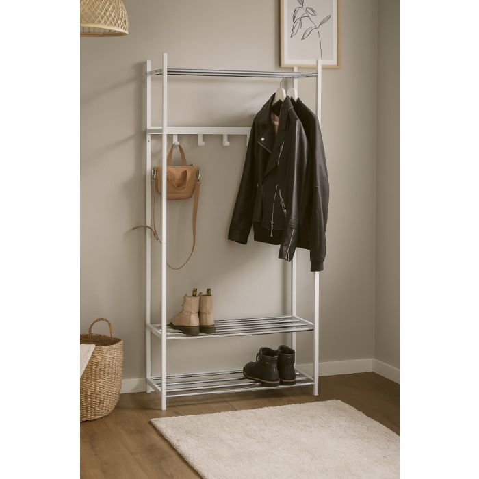 Tyylikkään Lidia-vaatenaulakon valkoinen runko sekä koukut ovat metallia ja ritiläputket kromattua metallia. Vaatenaulakon leveys on 80 cm, syvyys 35 cm ja korkeus 166 cm. Väli lattiasta alatasoon on 7 cm, kahden alimman hyllyn väli 25 cm ja kahden ylimmän hyllyn väli 122 cm. Ritiläputkien leveys on 76 cm. Toimitus osina.