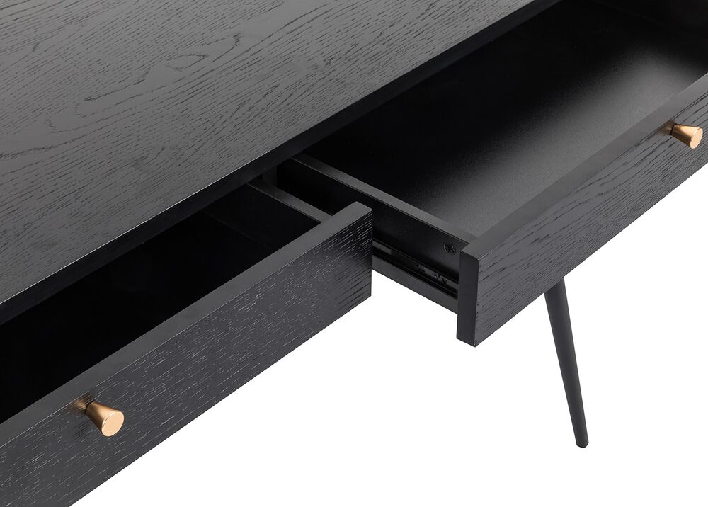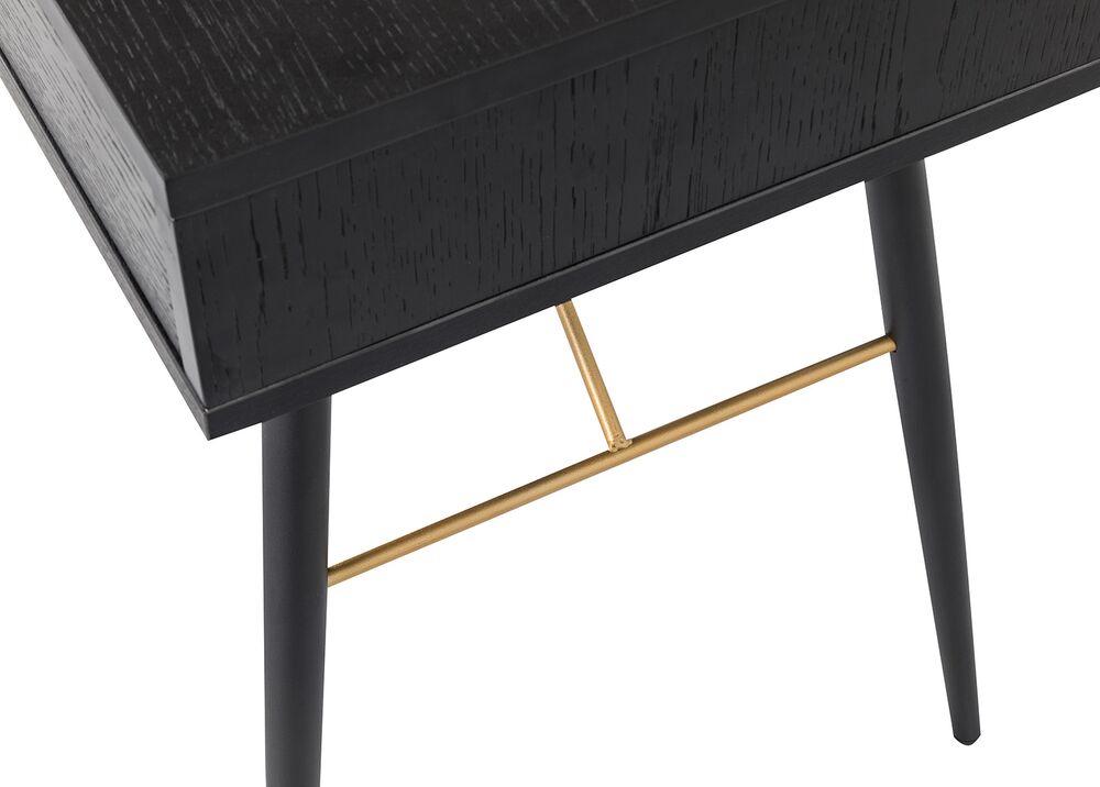 Tyylikäs musta työpöytä joka toimii myös eteispöytänä. Kullanväriset metalliosat tuovat tuotteeseen tyylikkyyttä