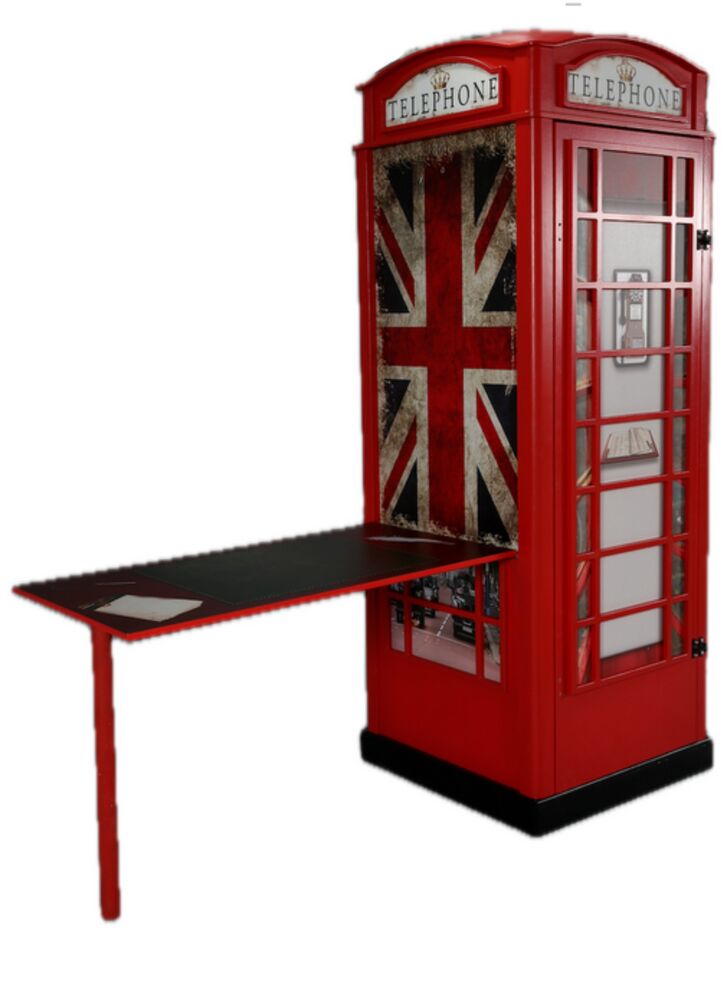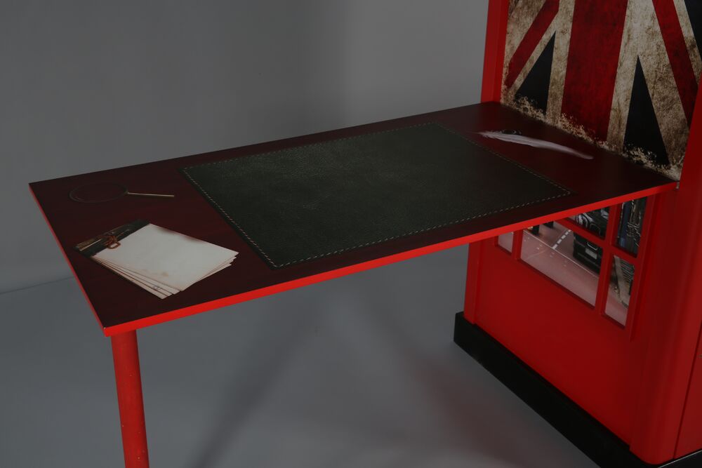 Mahtava työpöytä jossa puhelinkopin mallinen kaapisto esim. vaatesäilytykseen. Työpöytä voidaan asentaan kaapin oikealla tai vasemmalle puolelle. Työpöydässä saranointi, jonka ansiosta pöydän voi taittaa kaapin sivua vasten helposti.